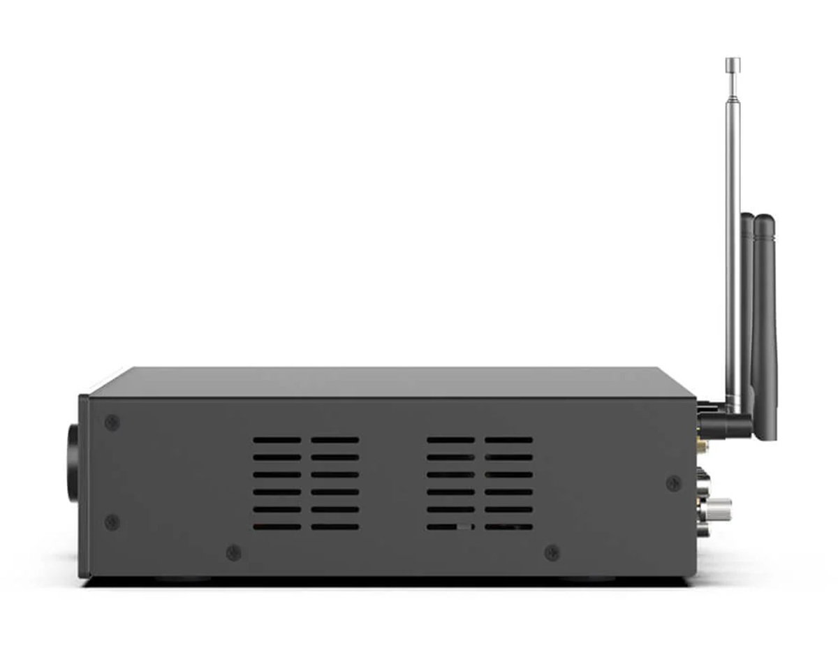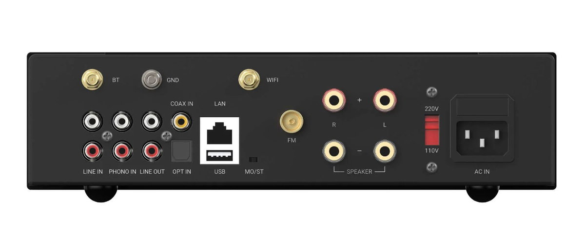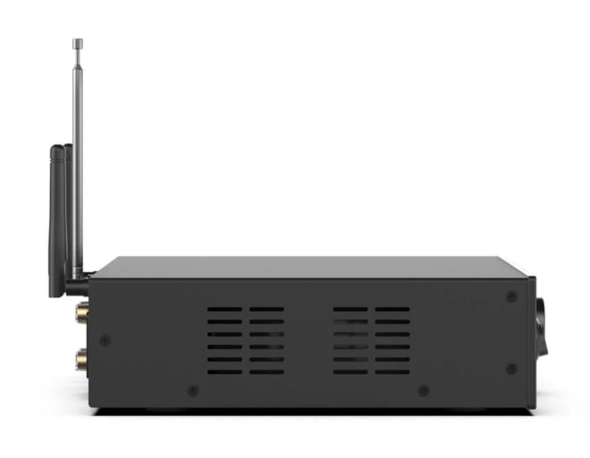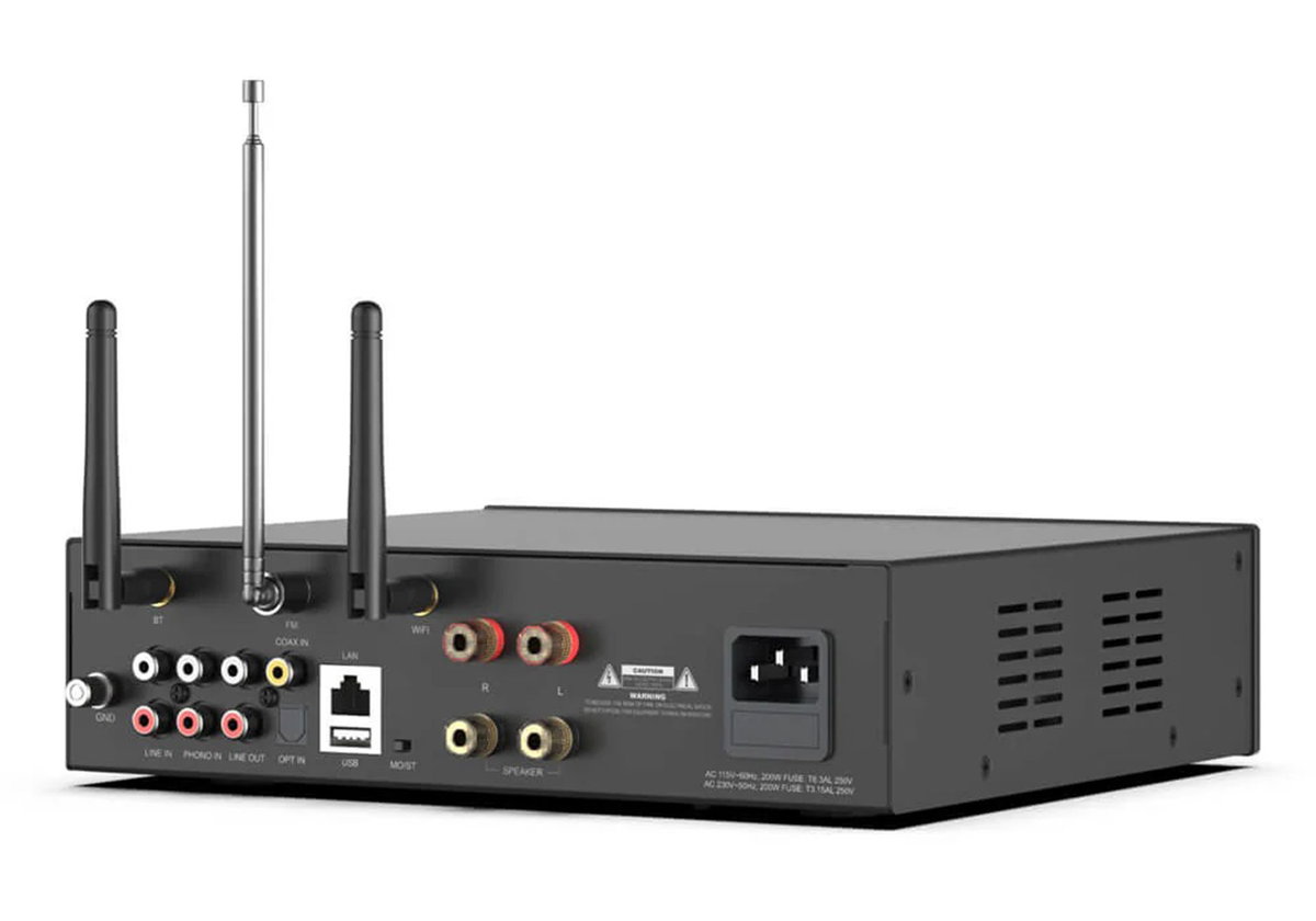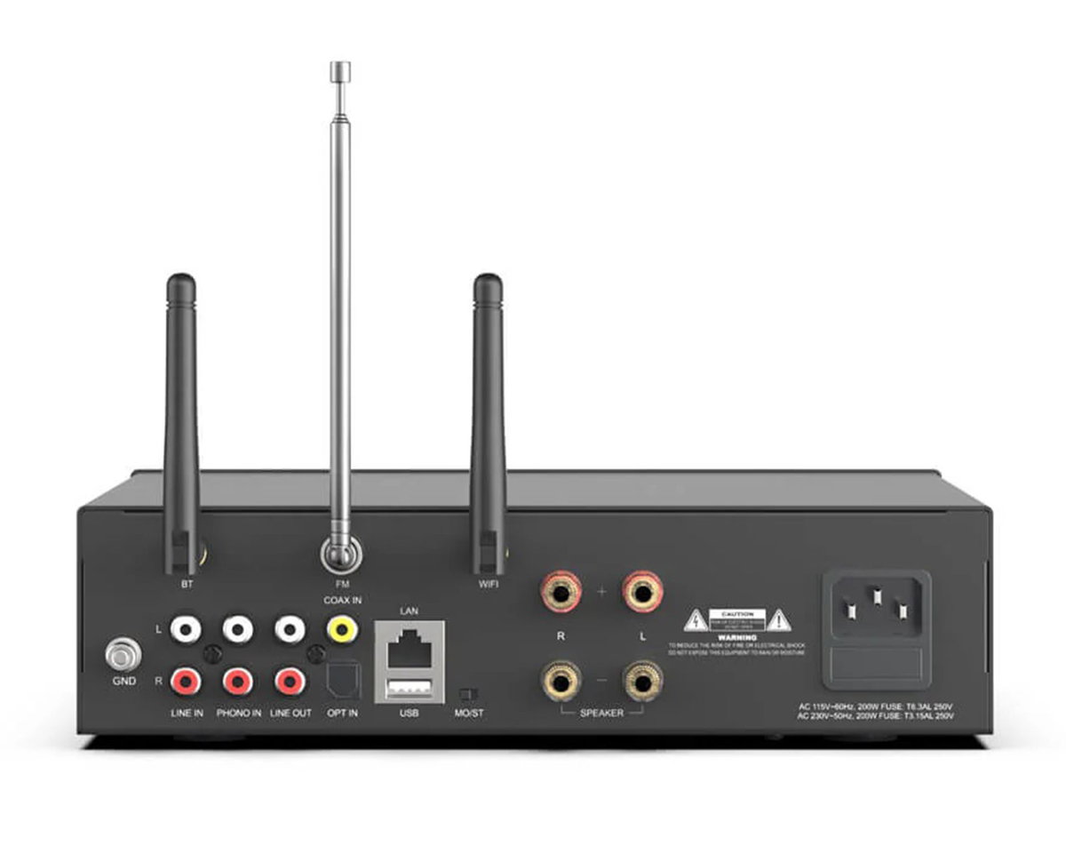 Amplificador con streaming. Airplay 2, Spotify Connect, Tidal, Qobuz, Wi-Fi, Bluetooth, USB. 2 x 60 W a 8 Ω.