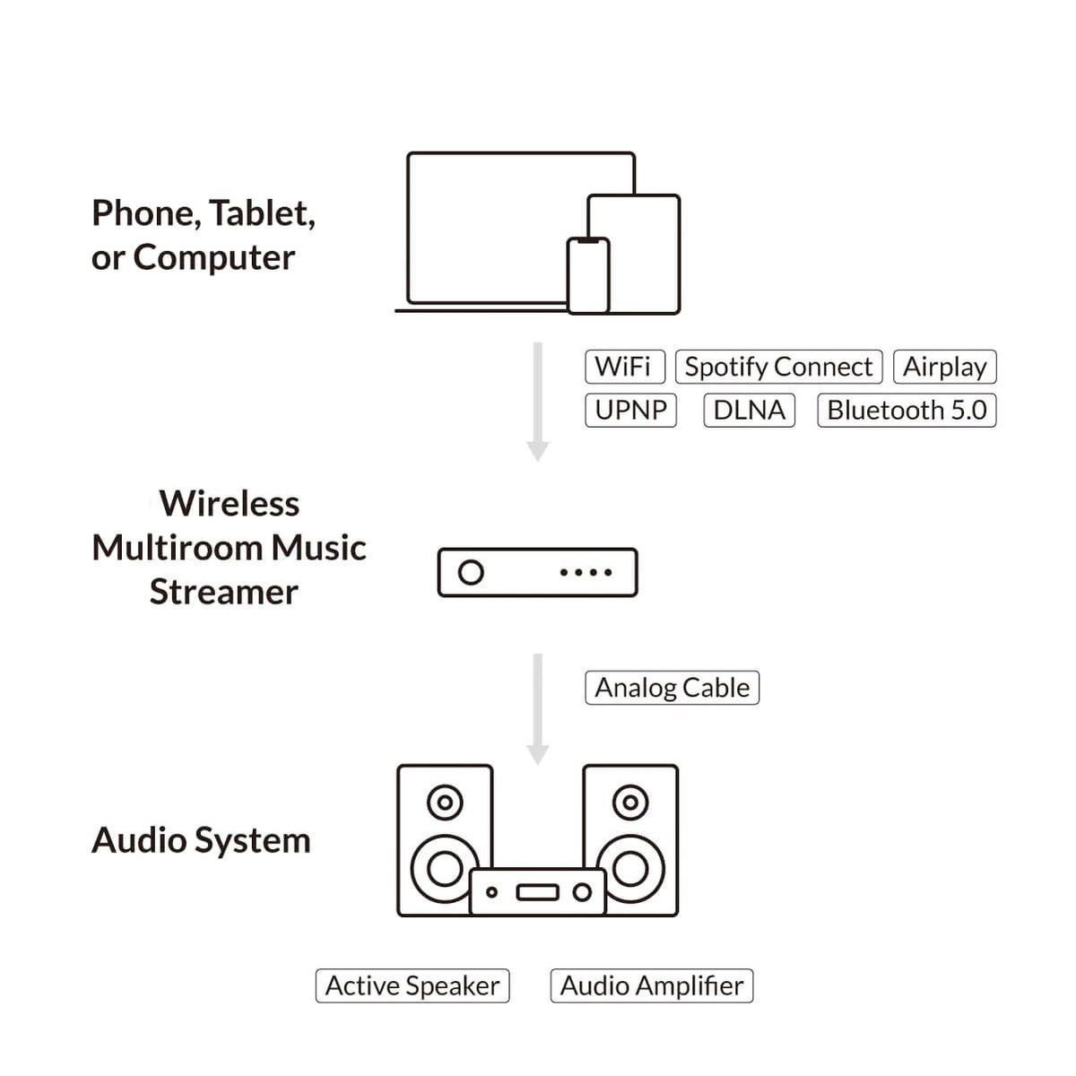 Controle sus dispositivos a través del navegador desde cualquier PC, tablet u otro dispositivo, no se requiere aplicación. O transmita música usando cualquier software compatible con los protocolos Airplay, Spotify Connect, UPNP o DLNA, incluidos iTunes, Spotify, Musicbee y más.
