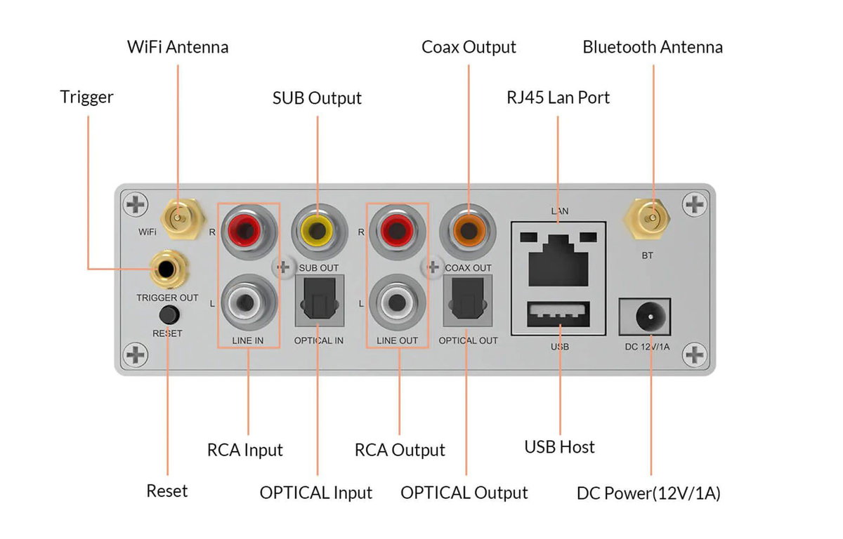 Con entrada de todo tipo como la entrada de línea RCA estéreo, entrada digital óptica S/PDIF, puerto USB host, puerto de LAN RJ45 (Ethernet).