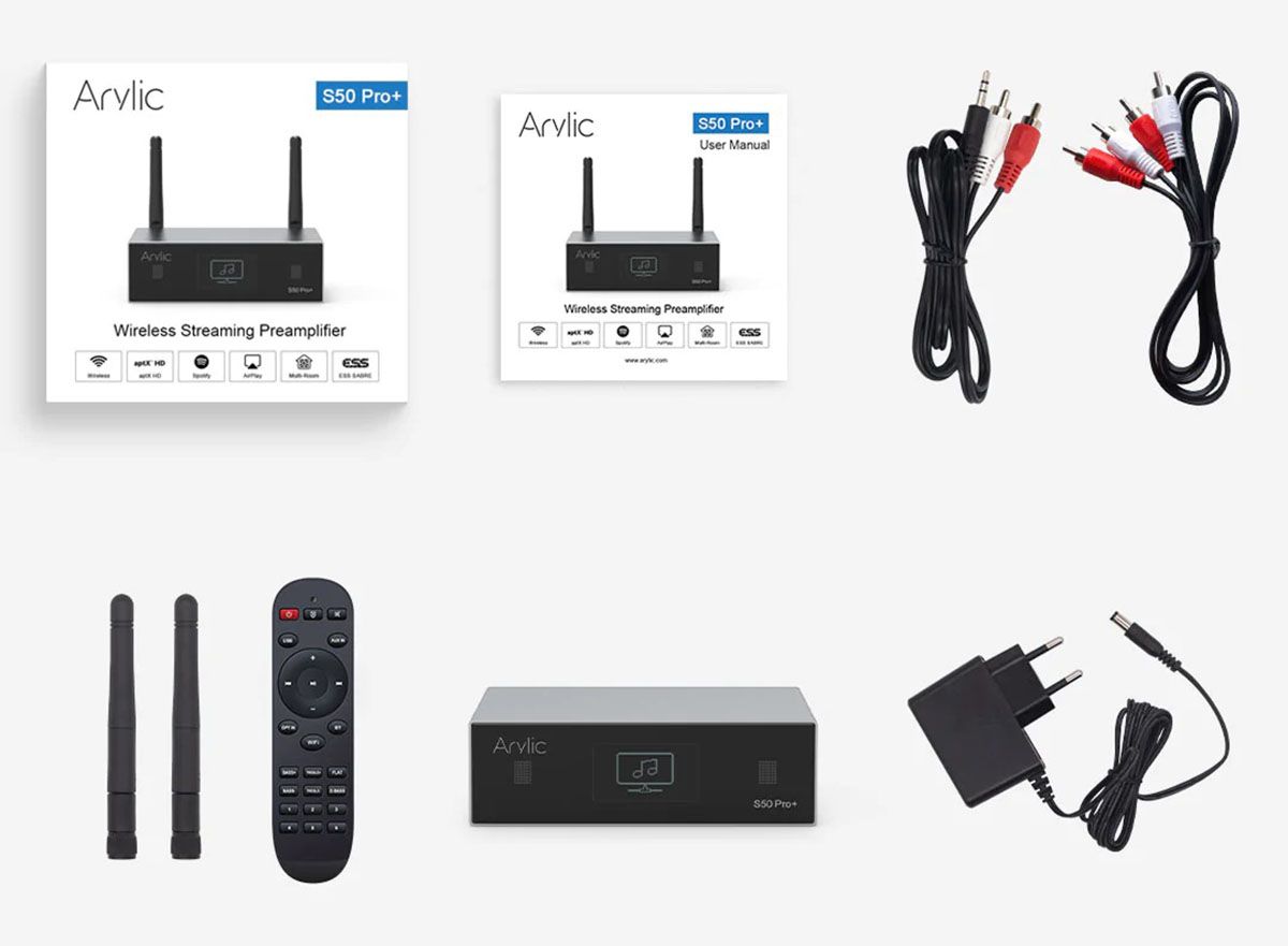 El reproductor de audio en red con preamplificador Arylic S50 Pro+, manual del usuario, control remoto, adaptador de corriente de 12V/1A, antenas externa Bluetooth y Wifi, cable auxiliar de RCA a RCA, cable de RCA a minijack de 3.5 mm.